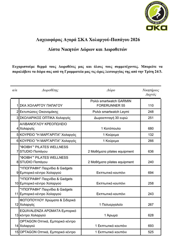 Με επιτυχία πραγματοποιήθηκε το Σάββατο 21 Μαρτίου η κλήρωση της λαχειοφόρου αγοράς του Συλλόγου μας, στο στάδιο Παπάγου, μετά το τέλος της προπόνησης. Ξεχωριστή νότα στη διαδικασία έδωσαν οι μικροί μας αθλητές από τα τμήματα ακαδημιών, οι οποίοι συμμετείχαν ενεργά στην κλήρωση των λαχνών, συμβάλλοντας με τον ενθουσιασμό τους στην όμορφη ατμόσφαιρα. Στο παρακάτω αρχείο, όπως και στις συνοδευτικές φωτογραφίες, μπορείτε να δείτε αναλυτικά τα αποτελέσματα της κλήρωσης και τους τυχερούς λαχνούς: